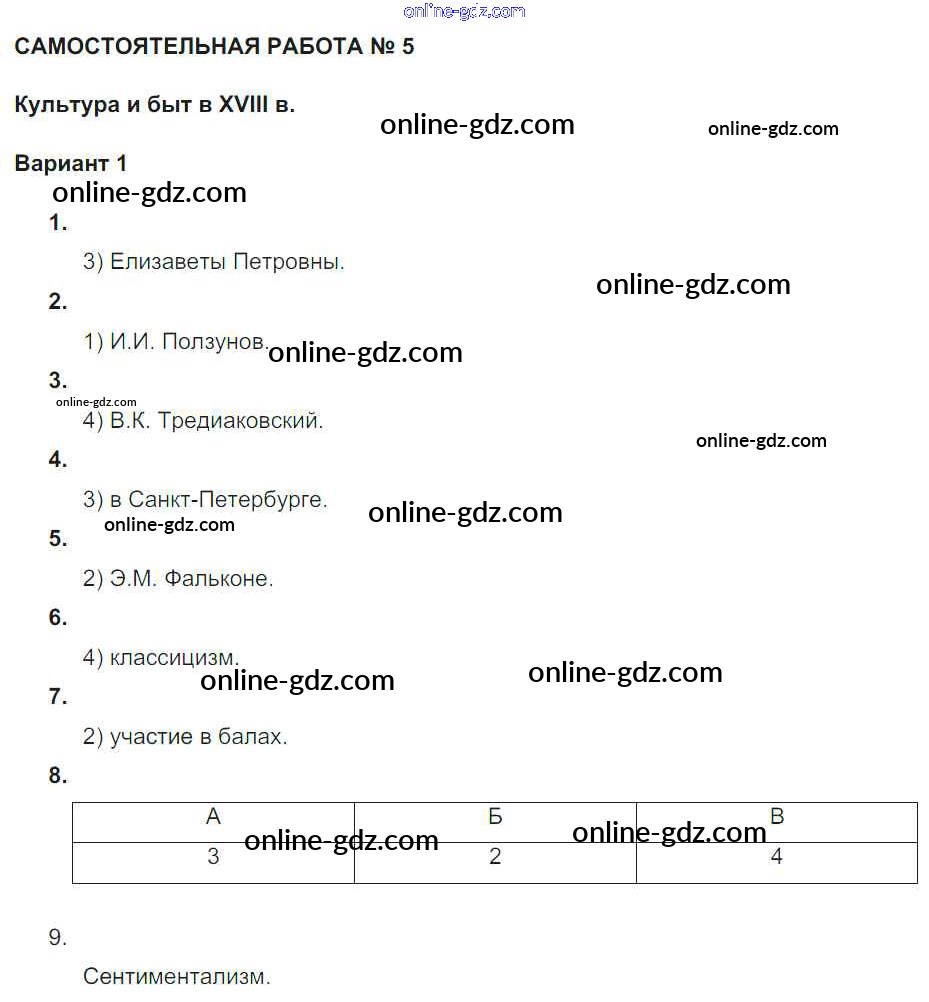 Готовые домашние задания по Истории за 7 класс Рабочая тетрадь Акиньшина, Артасов 2013 - СР-5. Культура и быт в XVIII веке Российская империя в 1762-1801 гг Вариант 1