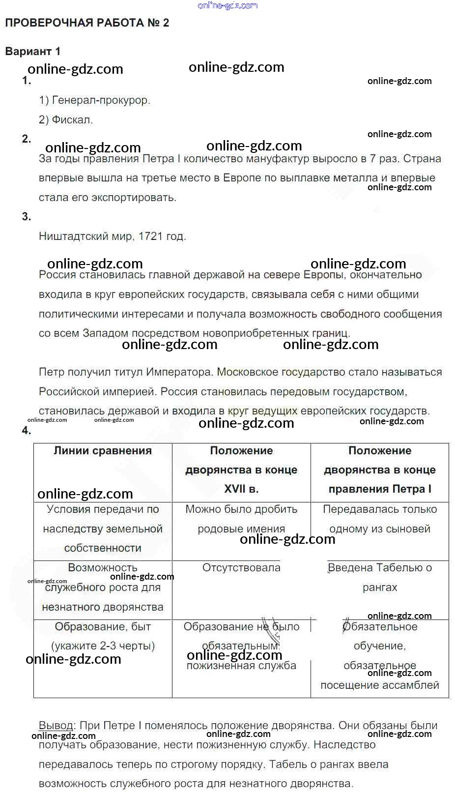 Готовые домашние задания по Истории за 7 класс Тетрадь-экзаменатор Артасов Сферы 2018 - Проверочная работа 2 Россия при Петре I Вариант 1