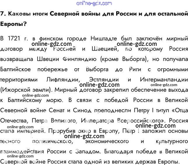 Готовые домашние задания по Истории за 8 класс Учебник Арсентьев, Курукин 2016 - Вопросы и задания §4. Великая Северная война 1700—1721 гг. 7