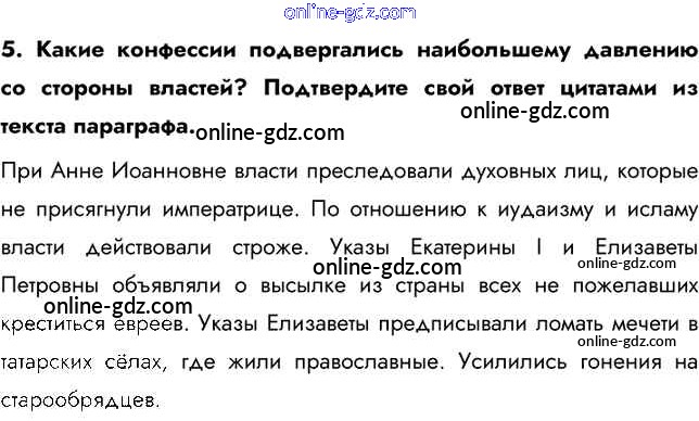 Готовые домашние задания по Истории за 8 класс Учебник Арсентьев, Курукин 2016 - Вопросы и задания Национальная и религиозная политика в 1725—1762 гг. 5