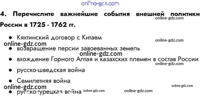 Готовые домашние задания по Истории за 8 класс Учебник Арсентьев, Курукин 2016 - Повторяем и делаем выводы Глава II. Россия при наследниках Петра: эпоха дворцовых переворотов 4