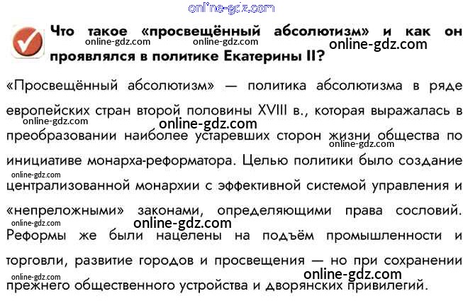 Готовые домашние задания по Истории за 8 класс Учебник Арсентьев, Курукин 2016 - Вопросы в начале параграфа §18. Внутренняя политика Екатерины II 1