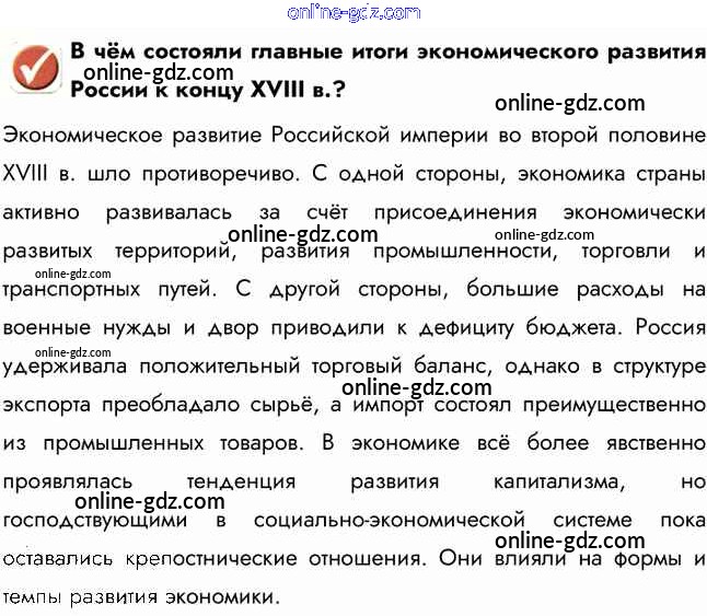 Готовые домашние задания по Истории за 8 класс Учебник Арсентьев, Курукин 2016 - Вопросы в начале параграфа §19. Экономическое развитие России при Екатерине II 1