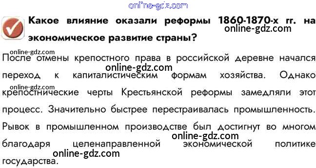 Готовые домашние задания по Истории за 9 класс Учебник Арсентьев, Данилов 2016 - Вопрос в начале параграфа § 18. Социально-экономическое развитие страны в пореформенный период 1