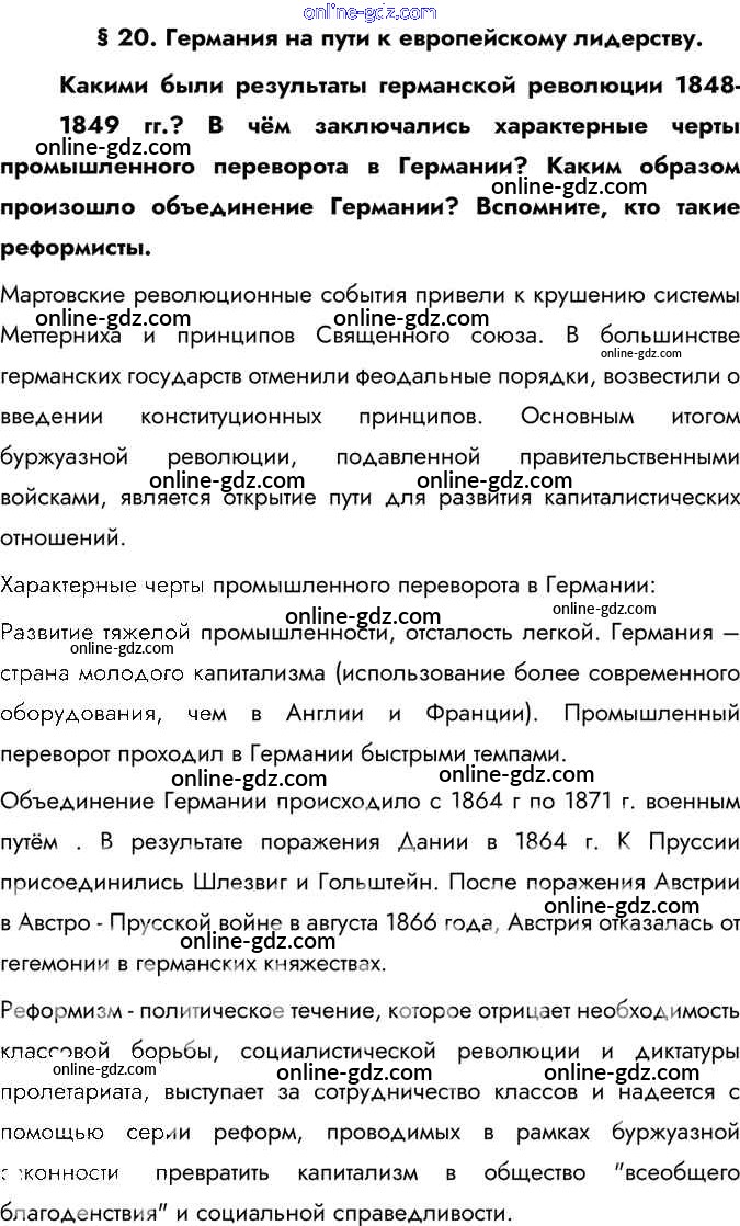 Готовые домашние задания по Истории за 9 класс Учебник Юдовская, Баранов 2019 - Вспомните §20. Германия на пути к европейскому лидерству 1