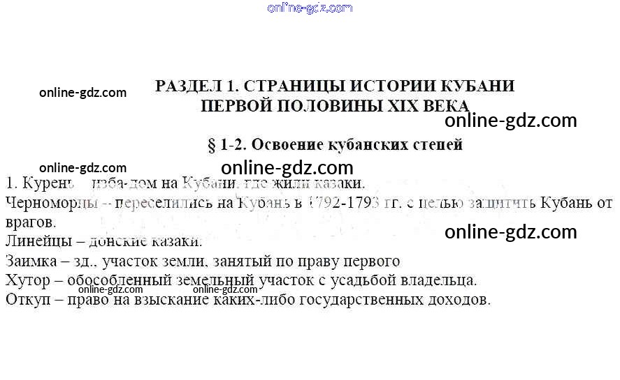 Готовые домашние задания по Кубановедению за 8 класс Рабочая тетрадь Гриценко 2018 - § 1-2. Освоение кубанских степей 1