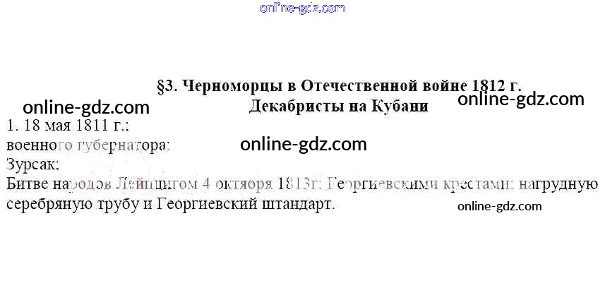 Готовые домашние задания по Кубановедению за 8 класс Рабочая тетрадь Гриценко 2018 - § 3. Черноморцы в Отечественной войне 1812 г. Декабристы на Кубани 1