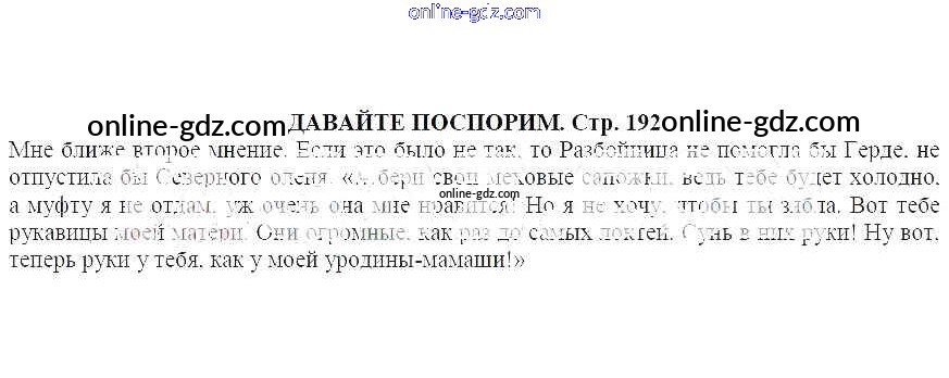 класс, от простых до сложных. Мы стремимся предоставить нашим пользователям максимально точные и полезные ответы к Учебнику Ланин, Устинова - Снежная Королева Часть 1 Давайте поспорим (стр.192), поэтому мы постоянно работаем над улучшением нашего контента. Мы всегда готовы помочь!