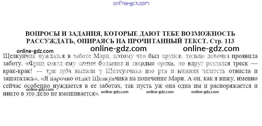 Готовые домашние задания по Литературе за 5 класс Учебник Москвин Алгоритм успеха 2020 - Щелкунчик и мышиный король Часть 1 Вопросы и задания, которые дают тебе возможность рассуждать, опираясь на прочитанный текст (стр. 113)