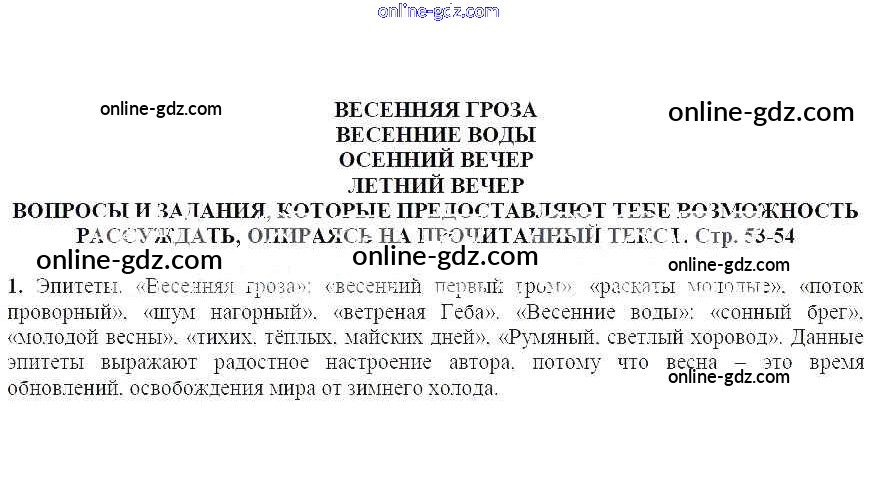 Готовые домашние задания по Литературе за 5 класс Учебник Москвин Алгоритм успеха 2020 - Вопросы и задания, которые дают тебе возможность рассуждать, опираясь на прочитанный текст (стр. 53-54) Весенняя гроза. Весенние воды. Осенний вечер. Летний вечер 1