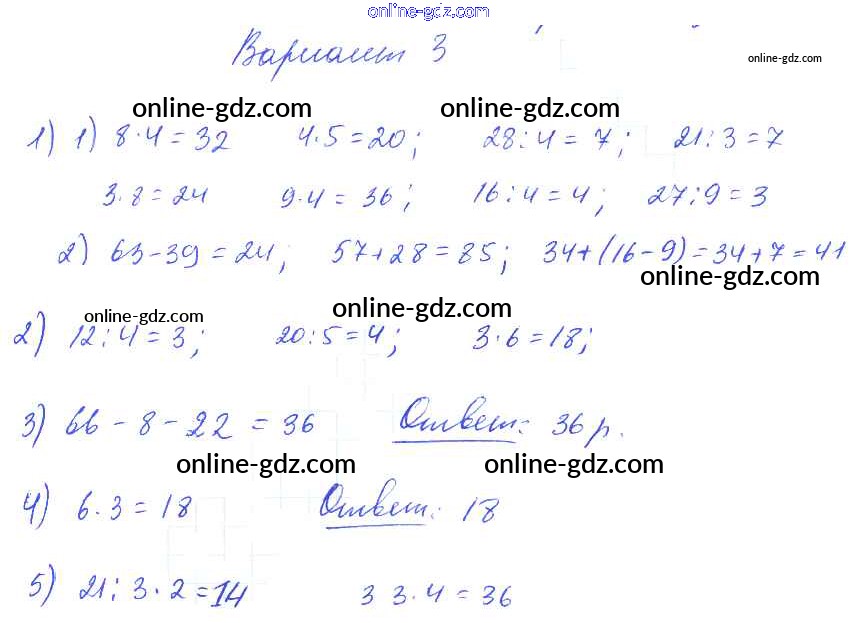 Готовые домашние задания по Математике за 2, 3, 4 класс Контрольные работы Волкова Школа России 2017 - Тема «Умножение и деление» стр. 35 3 Класс Вариант 3