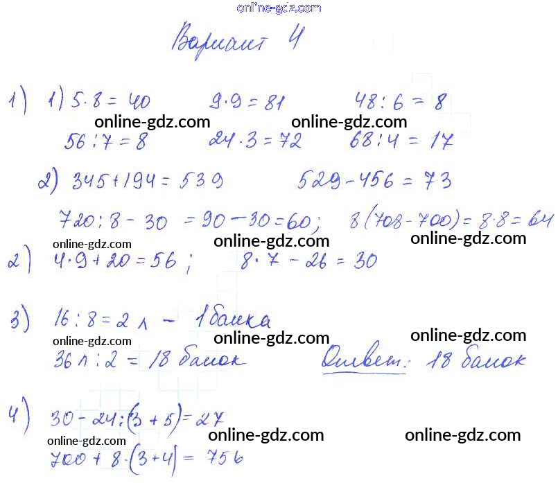 Готовые домашние задания по Математике за 2, 3, 4 класс Контрольные работы Волкова Школа России 2017 - Тема «Числа от 1 до 1000. Нумерация. Сложение и вычитание. Приемы устных и письменных вычислений» стр. 48 3 Класс Вариант 4