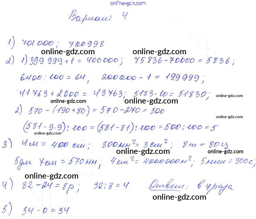 Готовые домашние задания по Математике за 2, 3, 4 класс Контрольные работы Волкова Школа России 2017 - Тема «Числа, которые больше 1000. Нумерация» стр. 57 4 Класс Вариант 4