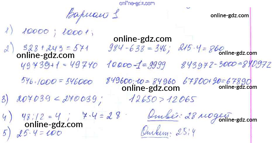 Готовые домашние задания по Математике за 2, 3, 4 класс Контрольные работы Волкова Школа России 2017 - Итоговая контрольная работа за 1 четверть 4 Класс Вариант 1