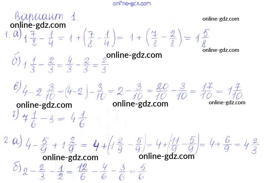 Готовые домашние задания по Математике за 5 класс Дидактические материалы Кузнецова, Минаева Академический школьный учебник 2014 - ПР №34. Вычитание смешанных дробей Проверочные работы вариант-1