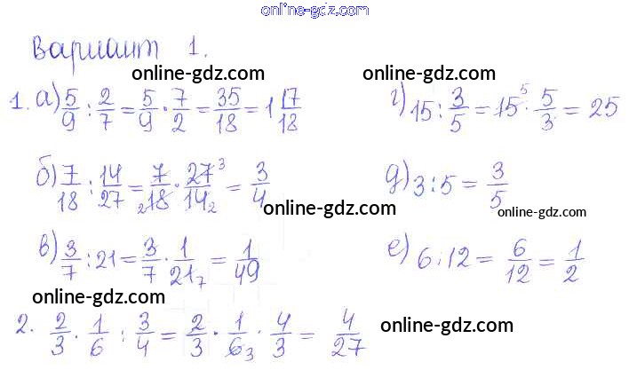 Готовые домашние задания по Математике за 5 класс Дидактические материалы Кузнецова, Минаева Академический школьный учебник 2014 - ПР №37. Деление дробей Проверочные работы вариант-1