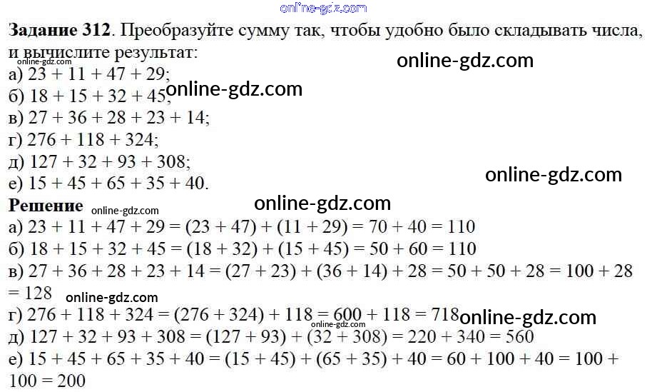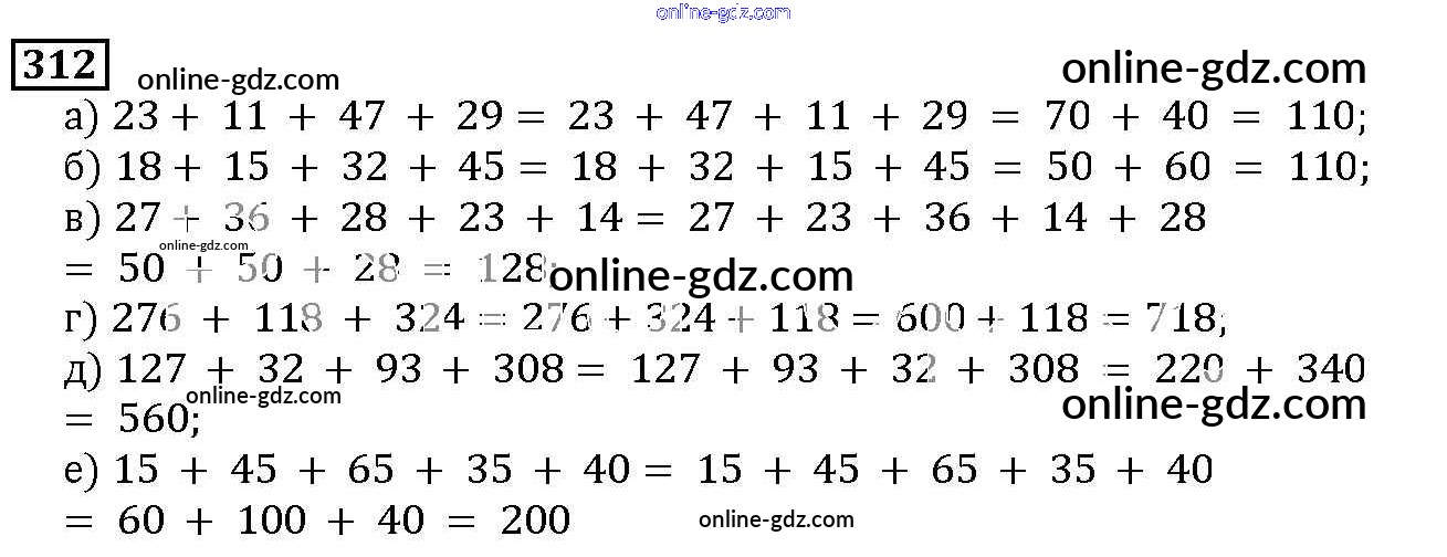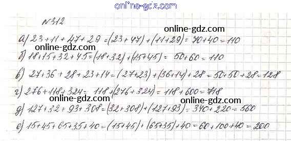 Готовые домашние задания по Математике за 5 класс Учебник Дорофеев, Шарыгин 2015 - 4.1. Свойства сложения и умножения Глава 4. Использование свойств действий при вычислениях 312
