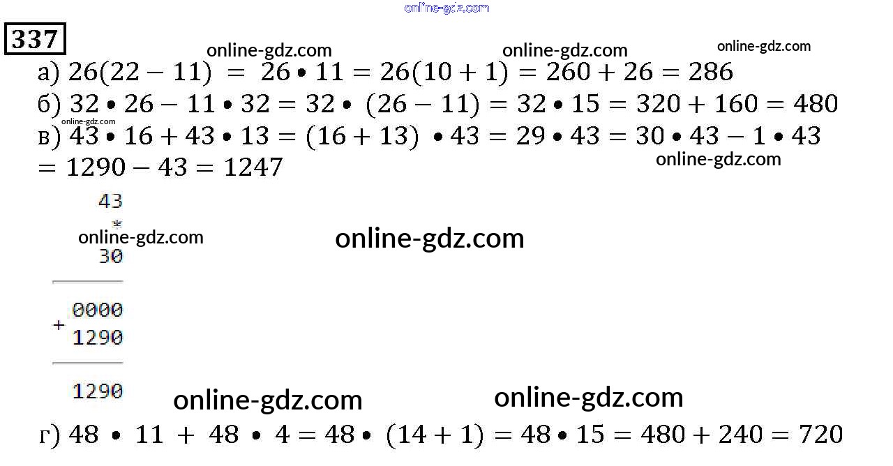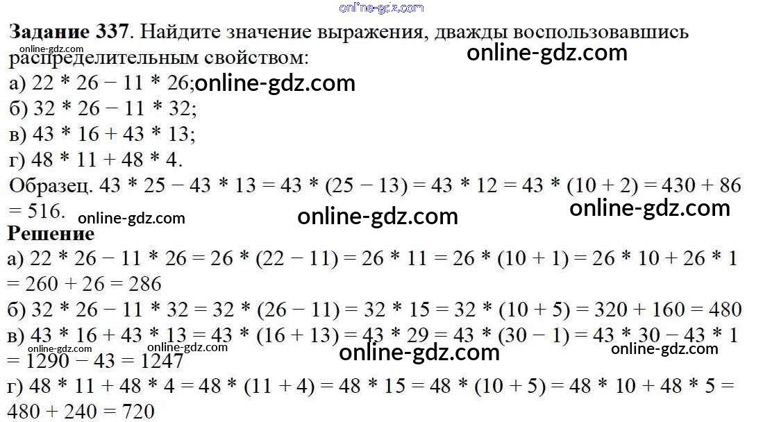 Готовые домашние задания по Математике за 5 класс Учебник Дорофеев, Шарыгин 2015 - 4.2. Распределительное свойство Глава 4. Использование свойств действий при вычислениях 337