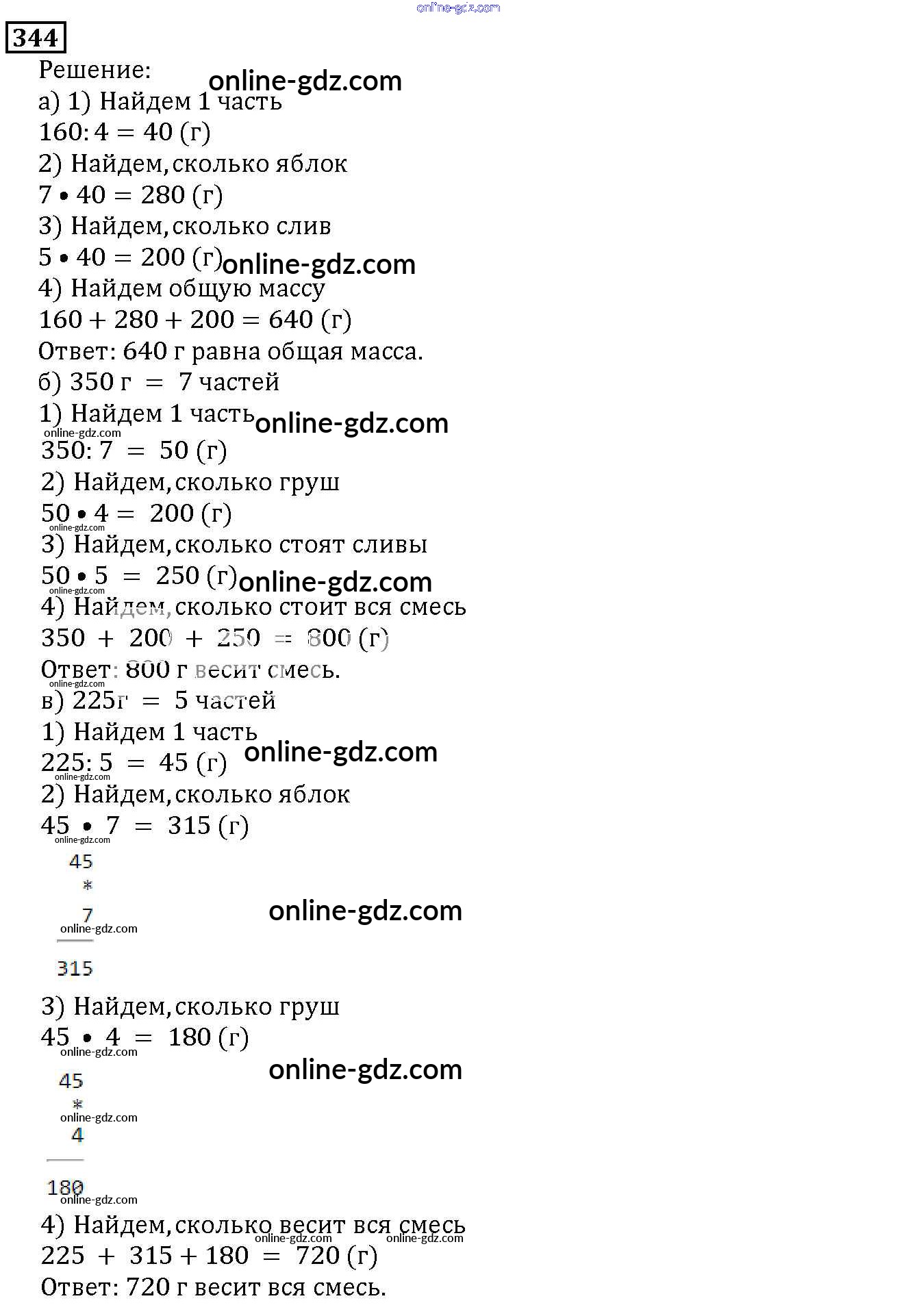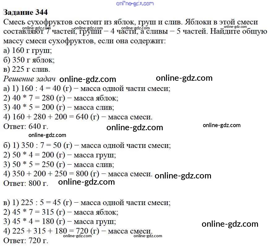 Готовые домашние задания по Математике за 5 класс Учебник Дорофеев, Шарыгин 2015 - 4.3. Задачи на части Глава 4. Использование свойств действий при вычислениях 344