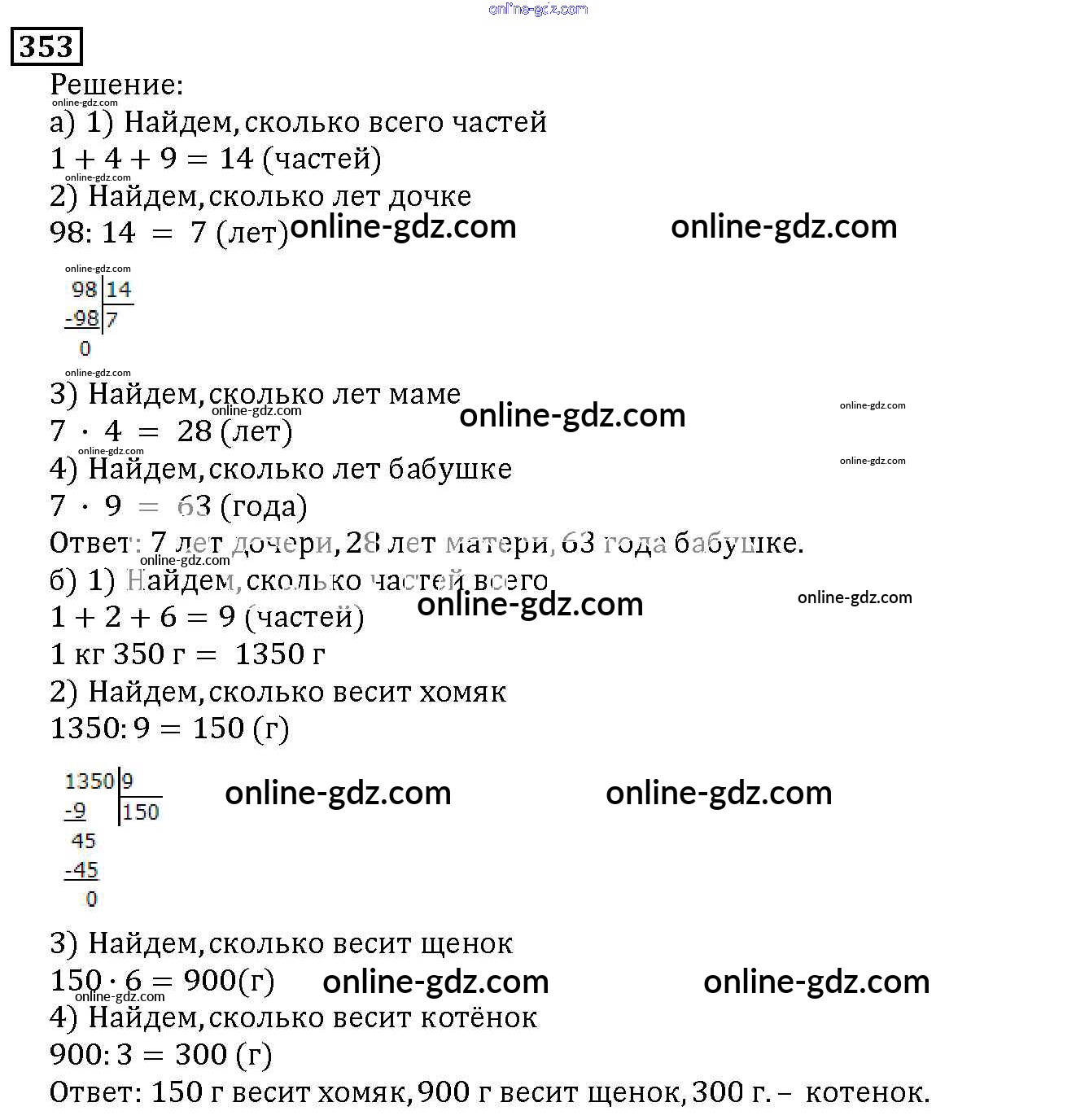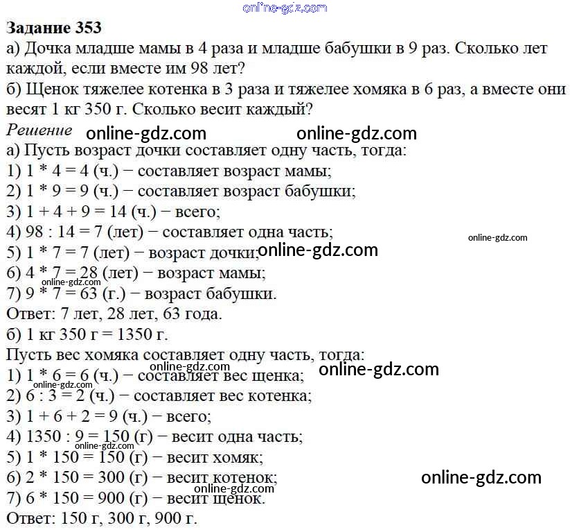 Готовые домашние задания по Математике за 5 класс Учебник Дорофеев, Шарыгин 2015 - 4.3. Задачи на части Глава 4. Использование свойств действий при вычислениях 353