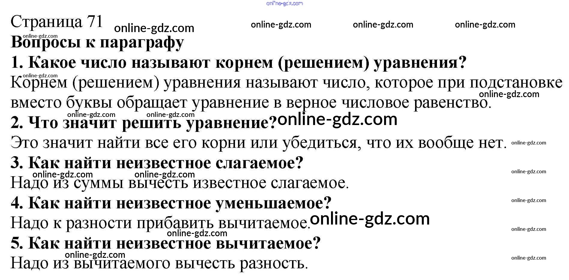Готовые домашние задания по Математике за 5 класс Учебник Мерзляк, Полонский Алгоритм успеха 2016 - Вопросы (страница 71) §10. Уравнение страница 71