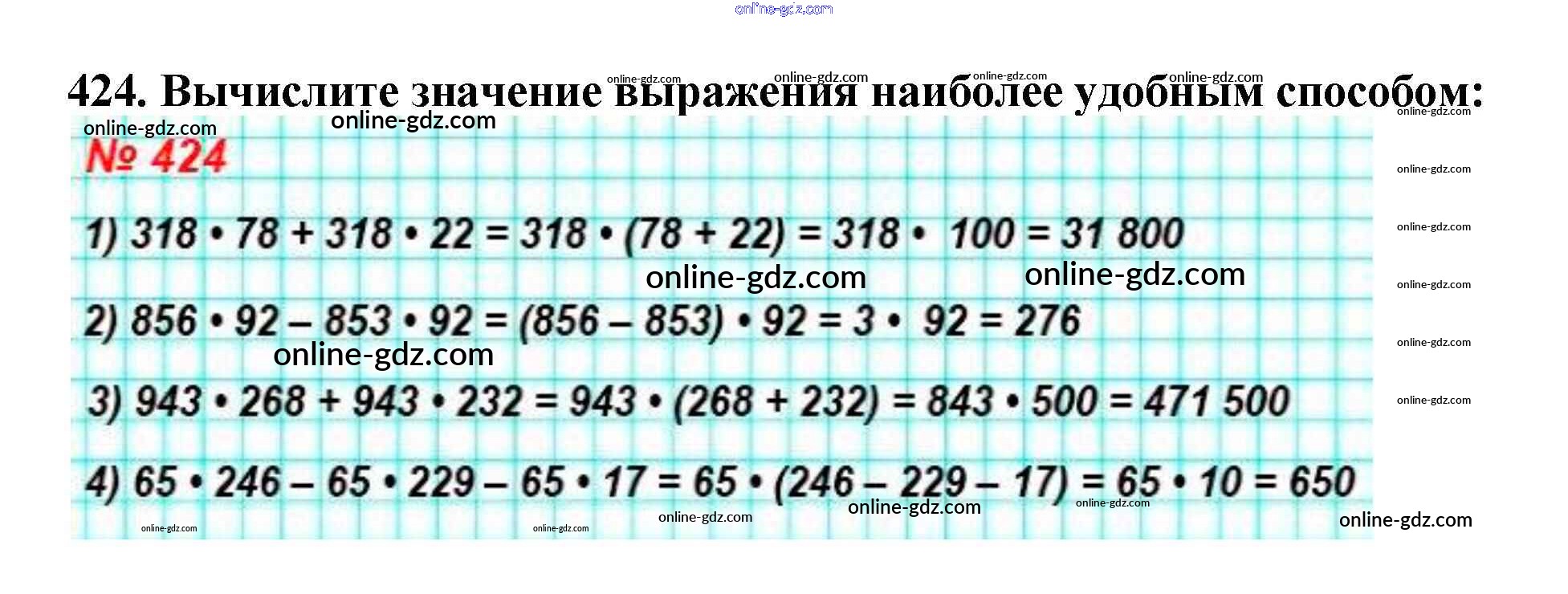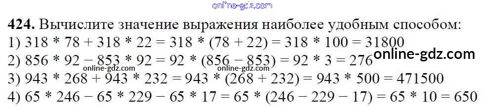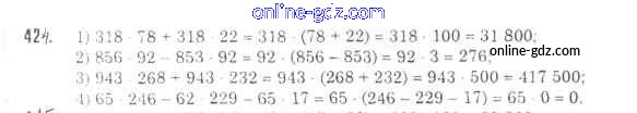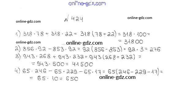 Готовые домашние задания по Математике за 5 класс Учебник Мерзляк, Полонский Алгоритм успеха 2016 - §17. Сочетательное и распределительное свойства умножения Глава 3. Умножение и деление натуральных чисел 424