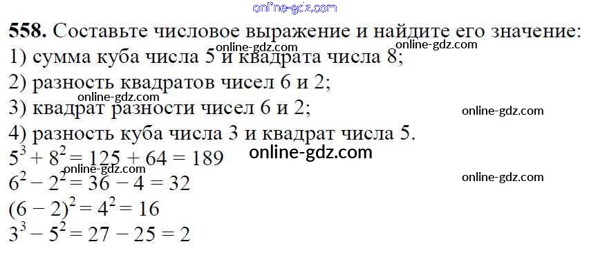Готовые домашние задания по Математике за 5 класс Учебник Мерзляк, Полонский Алгоритм успеха 2016 - §20. Степень числа Глава 3. Умножение и деление натуральных чисел 558