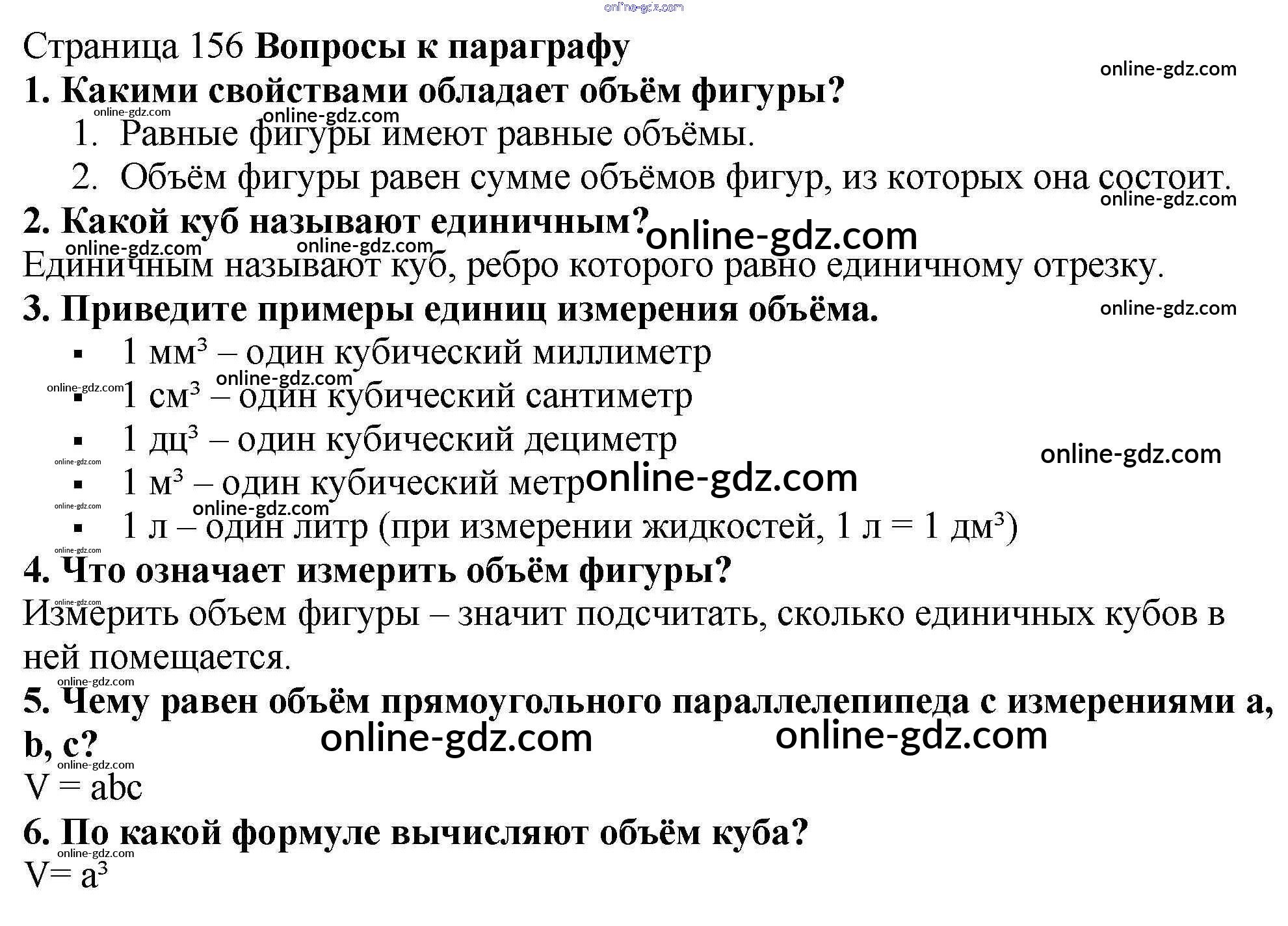 Готовые домашние задания по Математике за 5 класс Учебник Мерзляк, Полонский Алгоритм успеха 2016 - Вопросы (страница 156) §23. Объём прямоугольного параллелепипеда страница 156