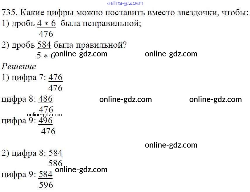 Готовые домашние задания по Математике за 5 класс Учебник Мерзляк, Полонский Алгоритм успеха 2016 - §26. Правильные и неправильные дроби. Сравнение дробей Глава 4. Обыкновенные дроби 735