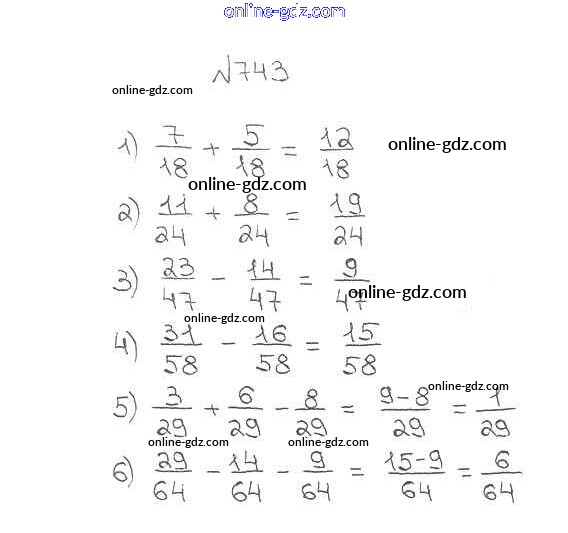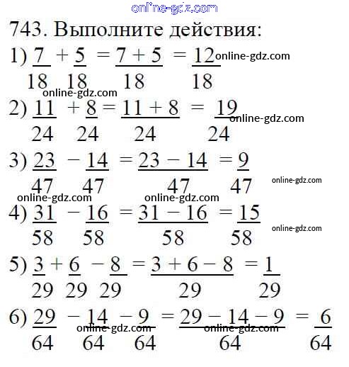 Готовые домашние задания по Математике за 5 класс Учебник Мерзляк, Полонский Алгоритм успеха 2016 - §27. Сложение и вычитание дробей с одинаковыми знаменателями Глава 4. Обыкновенные дроби 743
