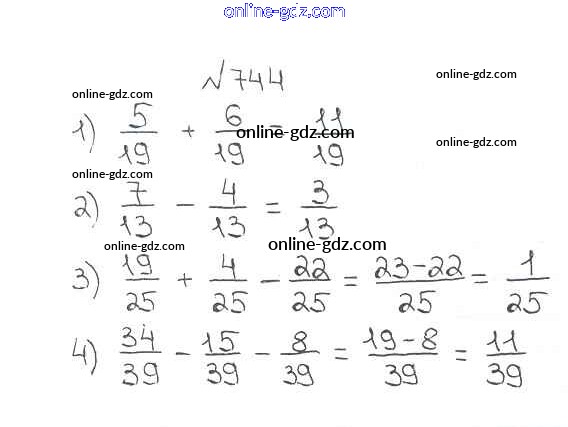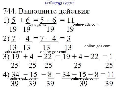 Готовые домашние задания по Математике за 5 класс Учебник Мерзляк, Полонский Алгоритм успеха 2016 - §27. Сложение и вычитание дробей с одинаковыми знаменателями Глава 4. Обыкновенные дроби 744