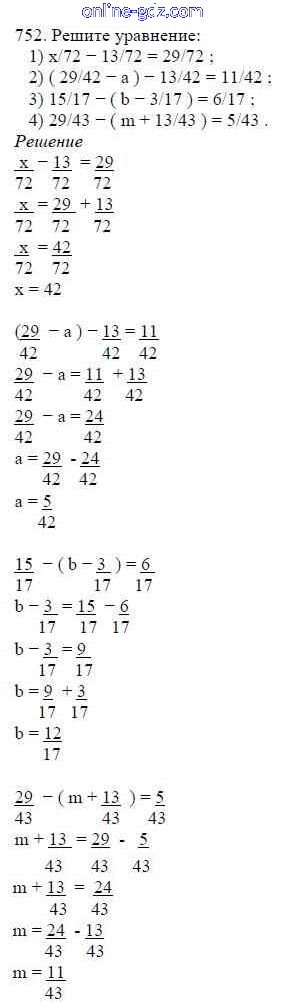 Готовые домашние задания по Математике за 5 класс Учебник Мерзляк, Полонский Алгоритм успеха 2016 - §27. Сложение и вычитание дробей с одинаковыми знаменателями Глава 4. Обыкновенные дроби 752