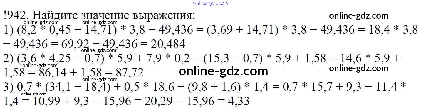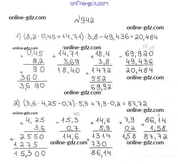 Готовые домашние задания по Математике за 5 класс Учебник Мерзляк, Полонский Алгоритм успеха 2016 - §34. Умножение десятичных дробей Глава 5. Десятичные дроби 942