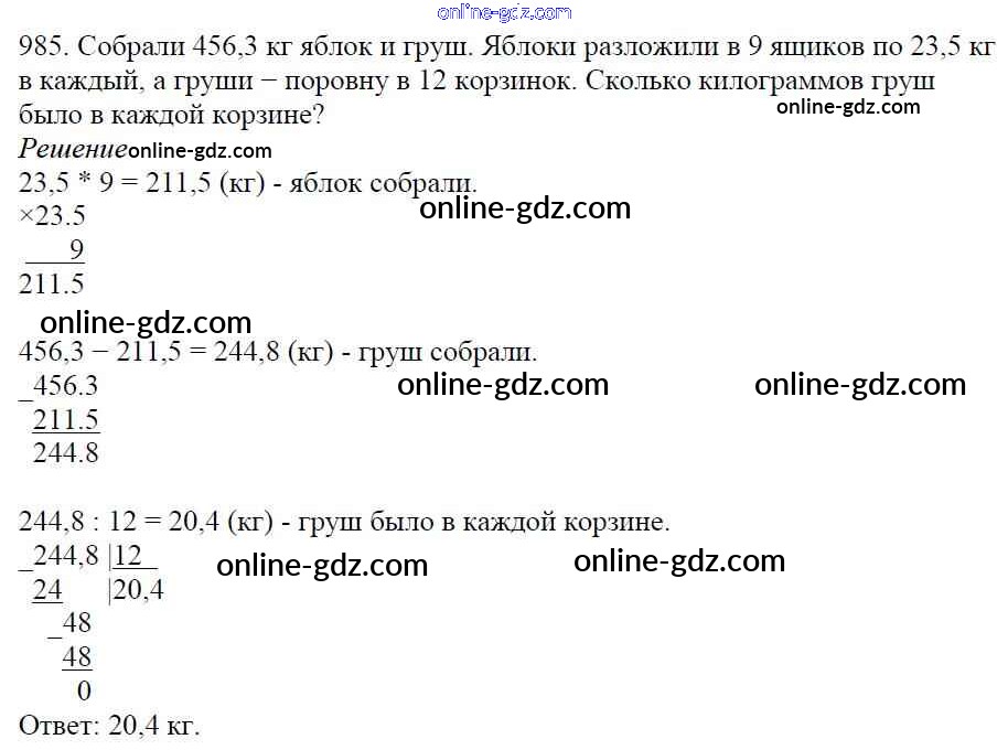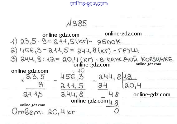 Готовые домашние задания по Математике за 5 класс Учебник Мерзляк, Полонский Алгоритм успеха 2016 - §35. Деление десятичных дробей Глава 5. Десятичные дроби 985