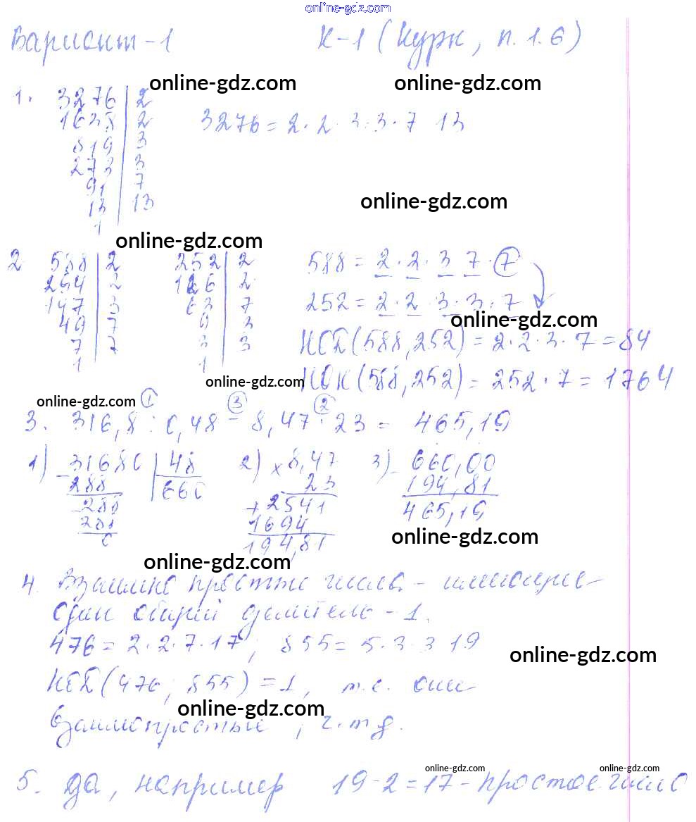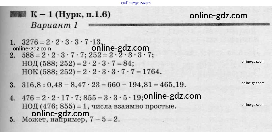 Готовые домашние задания по Математике за 6 класс Дидактические материалы Чесноков, Нешков 2014 - КР-1 к учебнику Нурка 1