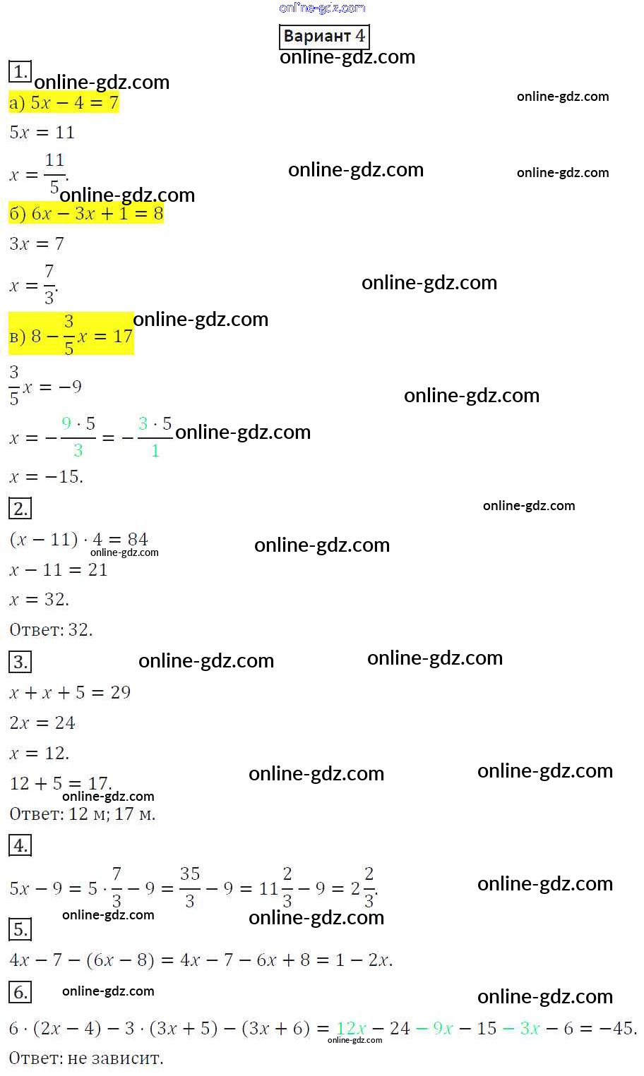 Готовые домашние задания по Математике за 6 класс Дидактические материалы Потапов, Шевкин МГУ - школе 2017 - КР-5. Варианты Контрольные работы 4