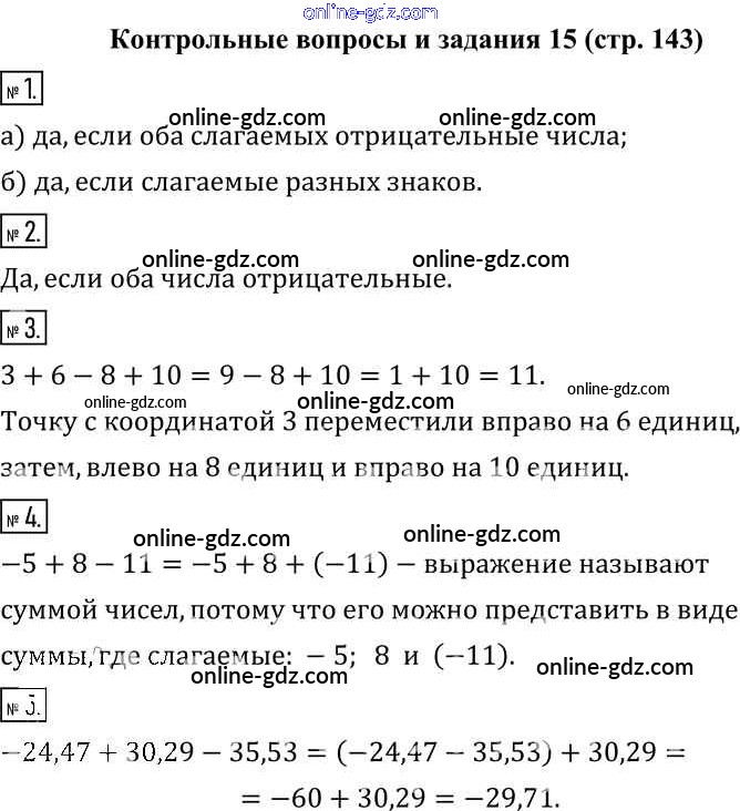 Готовые домашние задания по Математике за 6 класс Учебник Муравин, Муравина Вертикаль 2016 - §15. Сложение и вычитание чисел Контрольные вопросы и задания