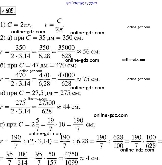 Готовые домашние задания по Математике за 6 класс Учебник Муравин, Муравина Вертикаль 2016 - §20. Длина окружности и площадь круга 605