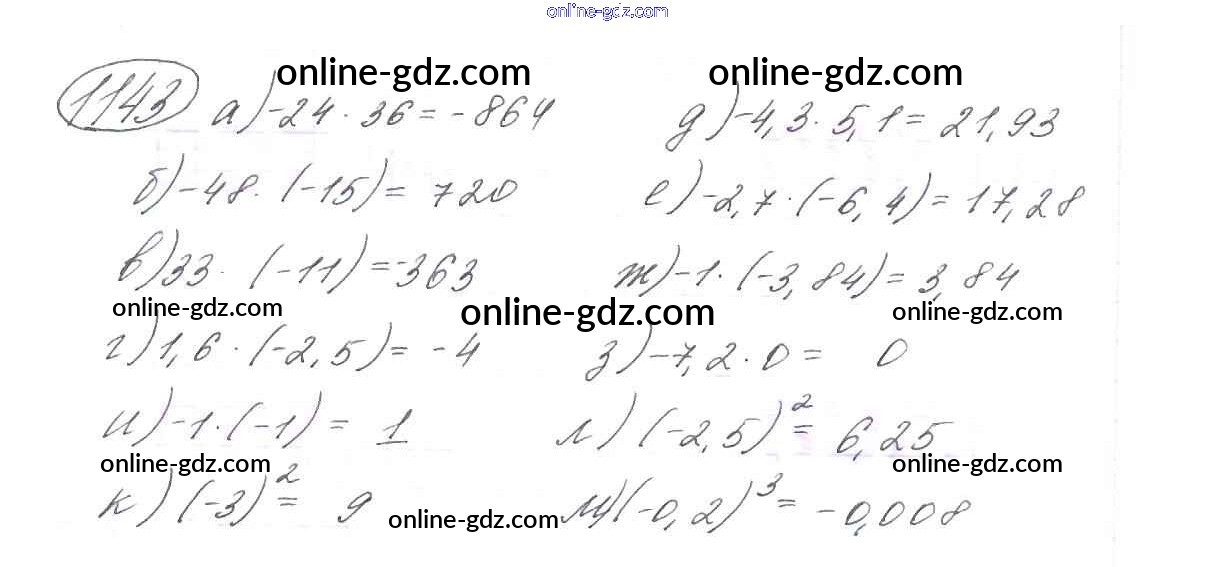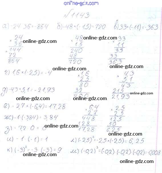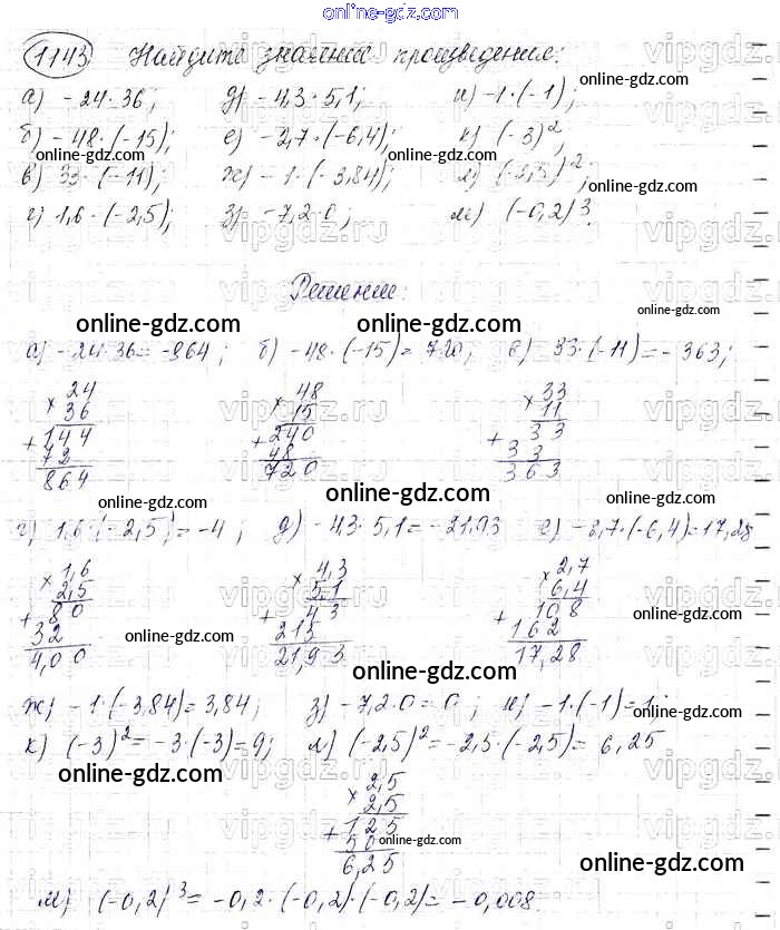 Готовые домашние задания по Математике за 6 класс Учебник Виленкин, Жохов 2014 - §7. Умножение и деление положительных и отрицательных чисел Глава 2 1143