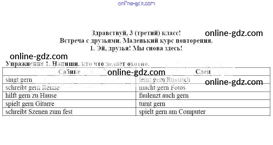 Готовые домашние задания по Немецкому языку за 3 класс Рабочая тетрадь Бим, Рыжова 2018 - Эй, друзья! Мы снова здесь! Здравствуй, 3 (третий) класс! Встреча с друзьями. Маленький курс повторения 1