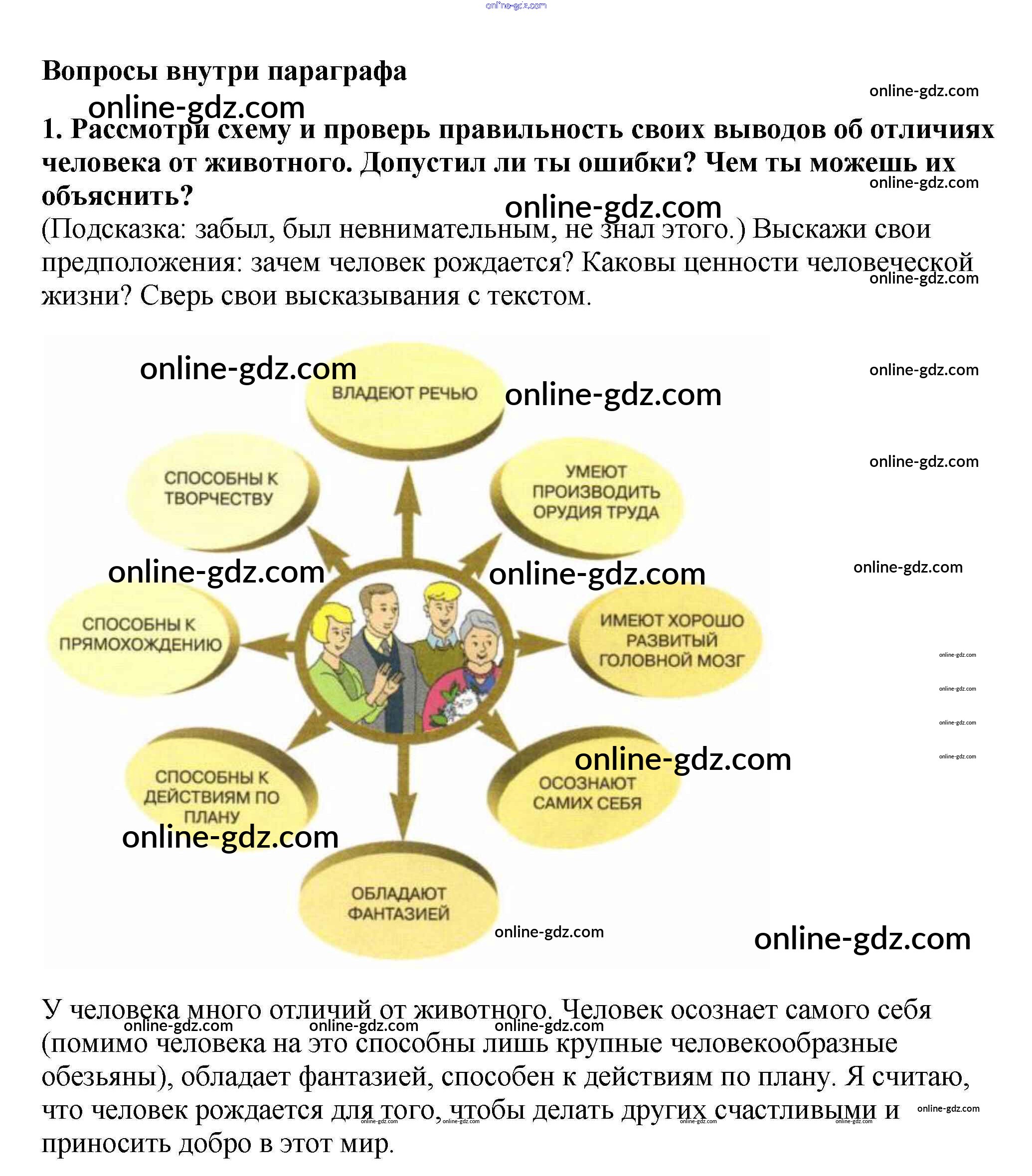 Готовые домашние задания по Обществознанию за 5 класс Учебник Боголюбов, Виноградова 2013 - Вопросы внутри параграфа §1. Загадка человека 1