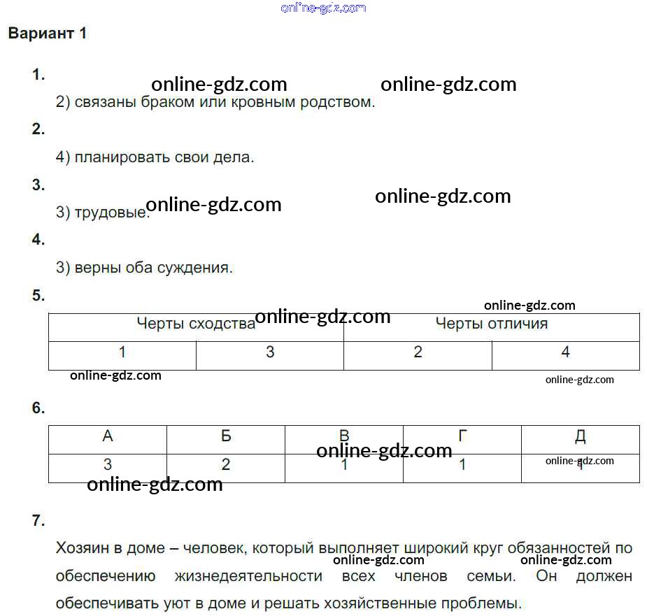 Готовые домашние задания по Обществознанию за 5, 6 класс Тематический контроль Лобанов 2017 - СР №1 Тема "Семья. Труд. Школа" вариант-1