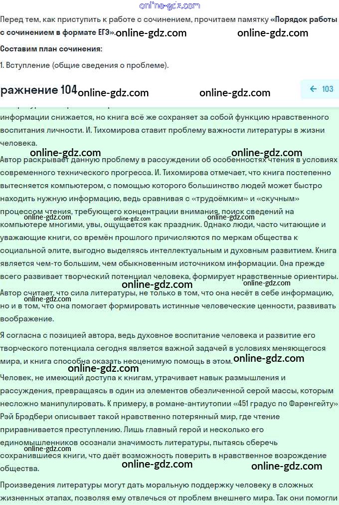 Готовые домашние задания по Русскому языку за 11 класс Учебник Гусарова Базовый и углубленный уровень 2022 - Упражнения 104