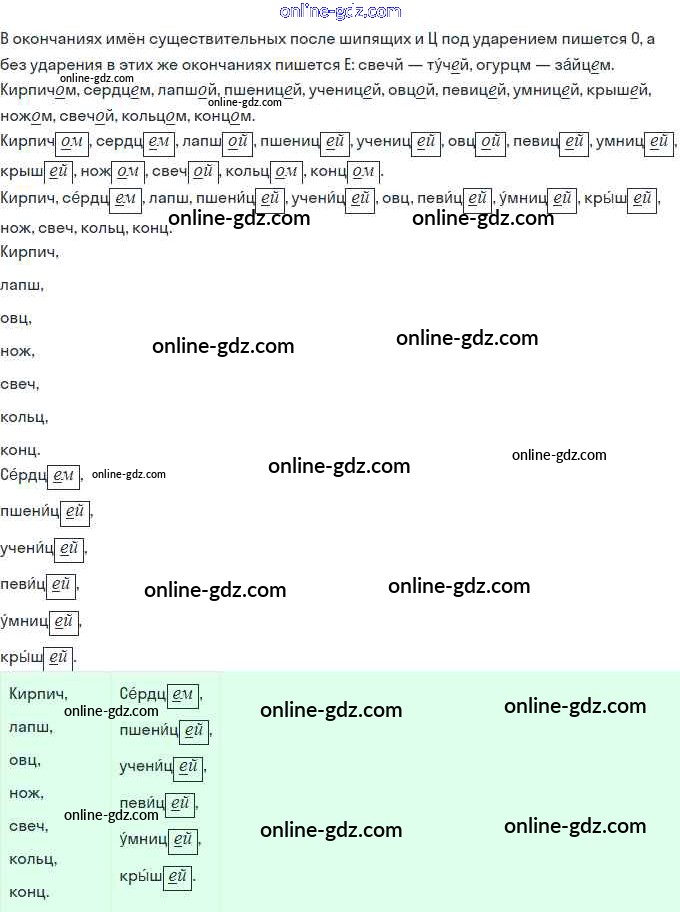Урок 100. Гласные о и е в окончаниях имён существительных после шипящих и ц