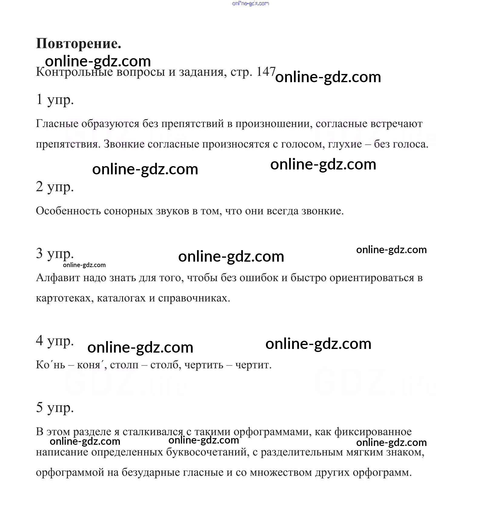 Готовые домашние задания по Русскому языку за 5 класс Учебник Баранов, Ладыженская 2016 - Повторение. Контрольные вопросы и задания Часть 1. Упражнения стр.147 (164-165)
