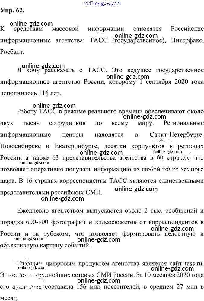 Готовые домашние задания по Русскому языку за 7 класс Учебник Быстрова, Кибирева Инновационная школа 2019 - Упражнения Часть 1 62