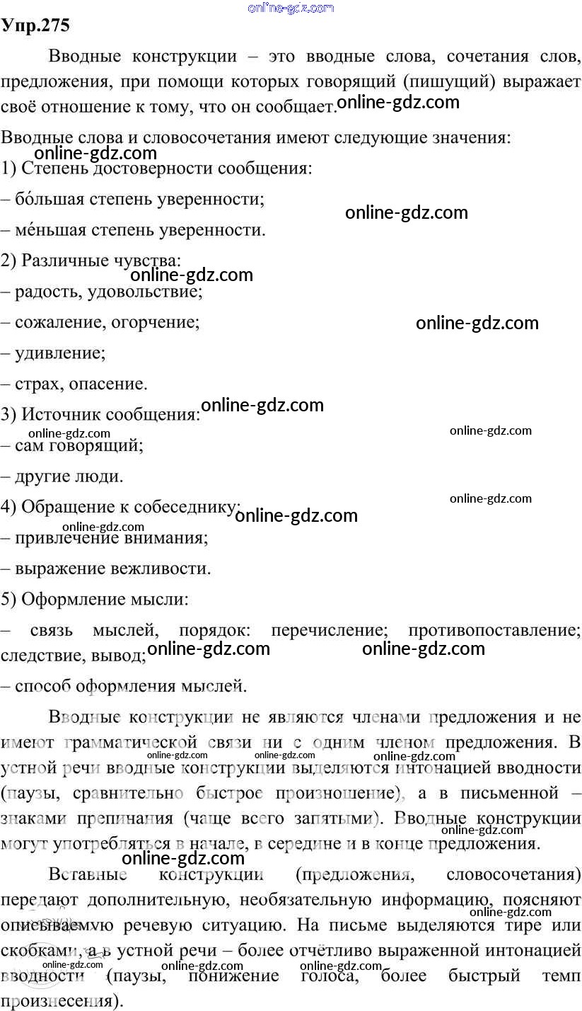 Готовые домашние задания по Русскому языку за 8 класс Учебник Разумовская, Львова Вертикаль 2013 - Упражнения 275